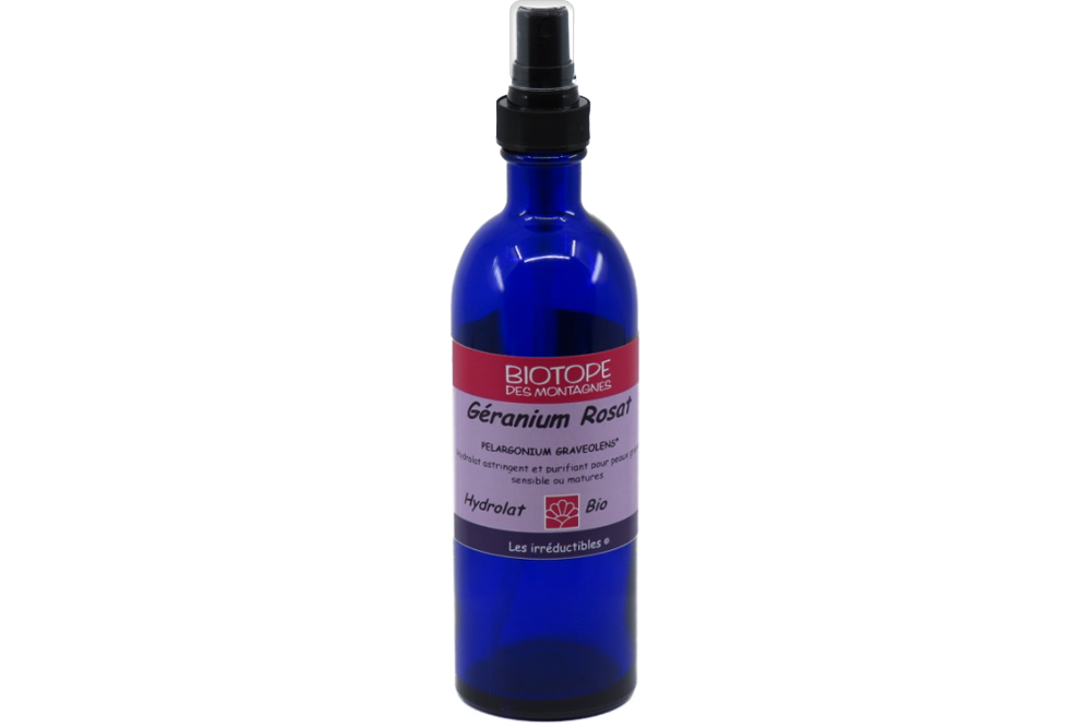 Nous distillons le géranium uniquement pour l’obtention de l’eau florale. La concentration de nos eaux florales est optimale car nous utilisons de l’eau de source et à très faible dose. Ceci nous permet d’offrir une eau florale pure sans avoir à ajouter de conservateur. C’est, pour nous, un engagement de qualité.
