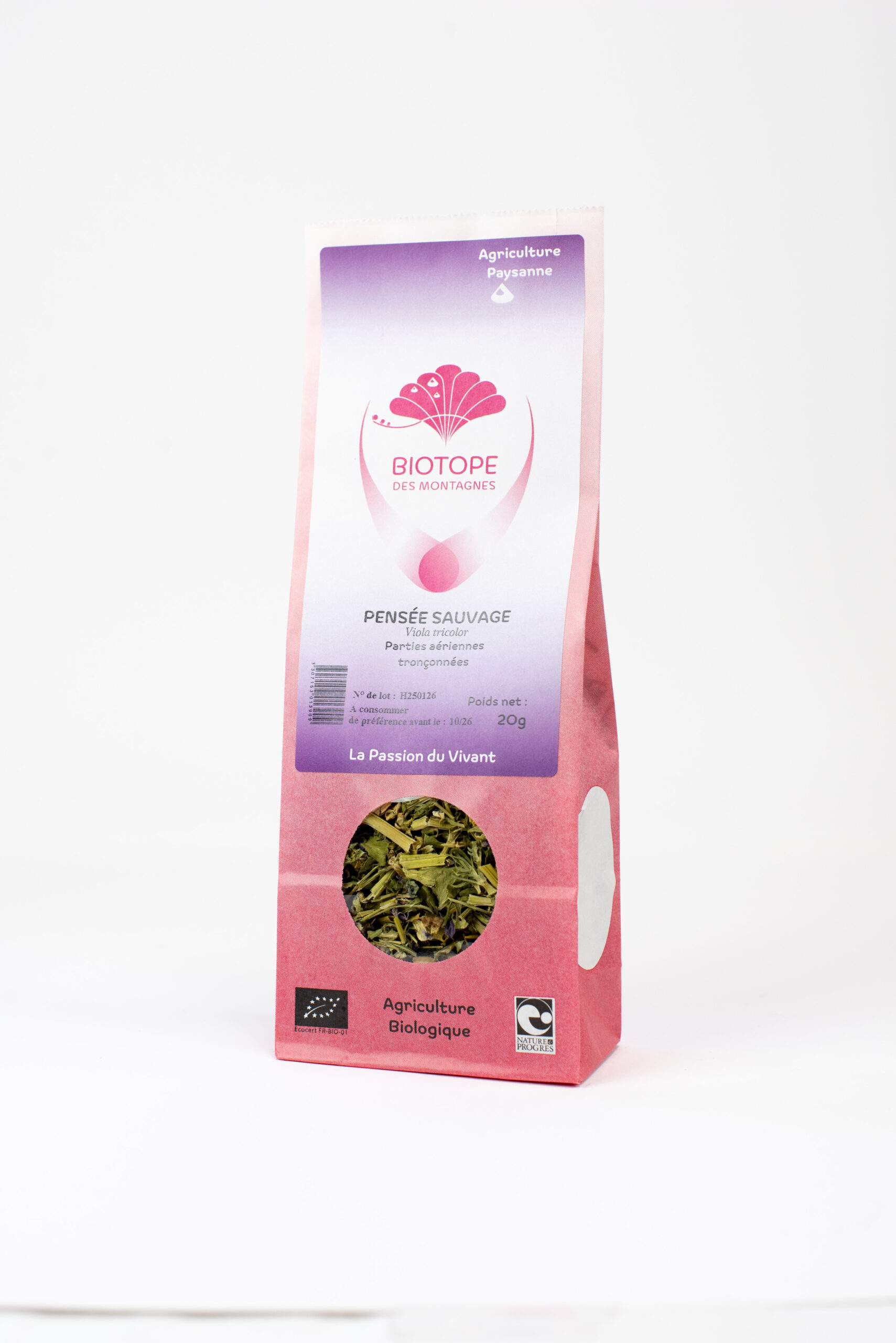 La pensée nous offre ses jolis visages une grande partie de l'été et nous cueillons ses parties aériennes qui seront légèrement tronçonnées avant séchage. C'est une tisane qui apporte ses bienfaits avec douceur.